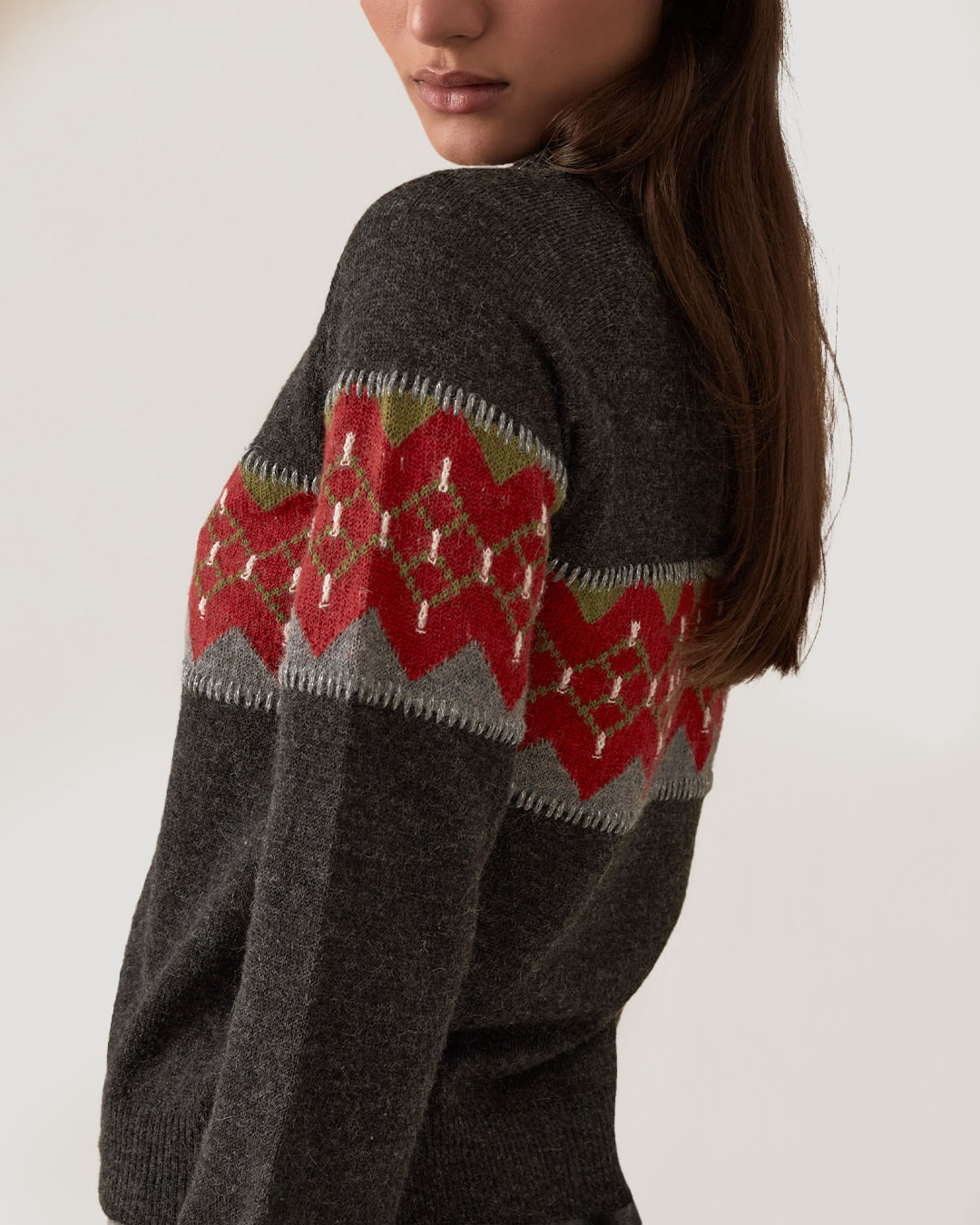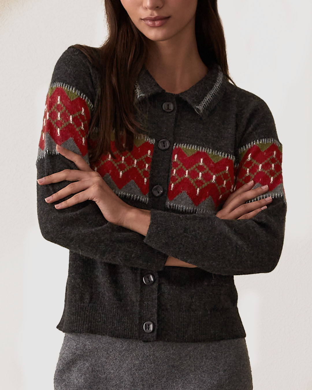 The Embroidered Cardigan offers a comfortable look and exceptional softness. This cardigan features embroidered designs on the collar, torso, and arms, adding a unique touch of style to your outfit. Additionally, it has a front button closure that combines functionality and elegance. It is made from 100% Baby Alpaca, ensuring its quality and comfort.